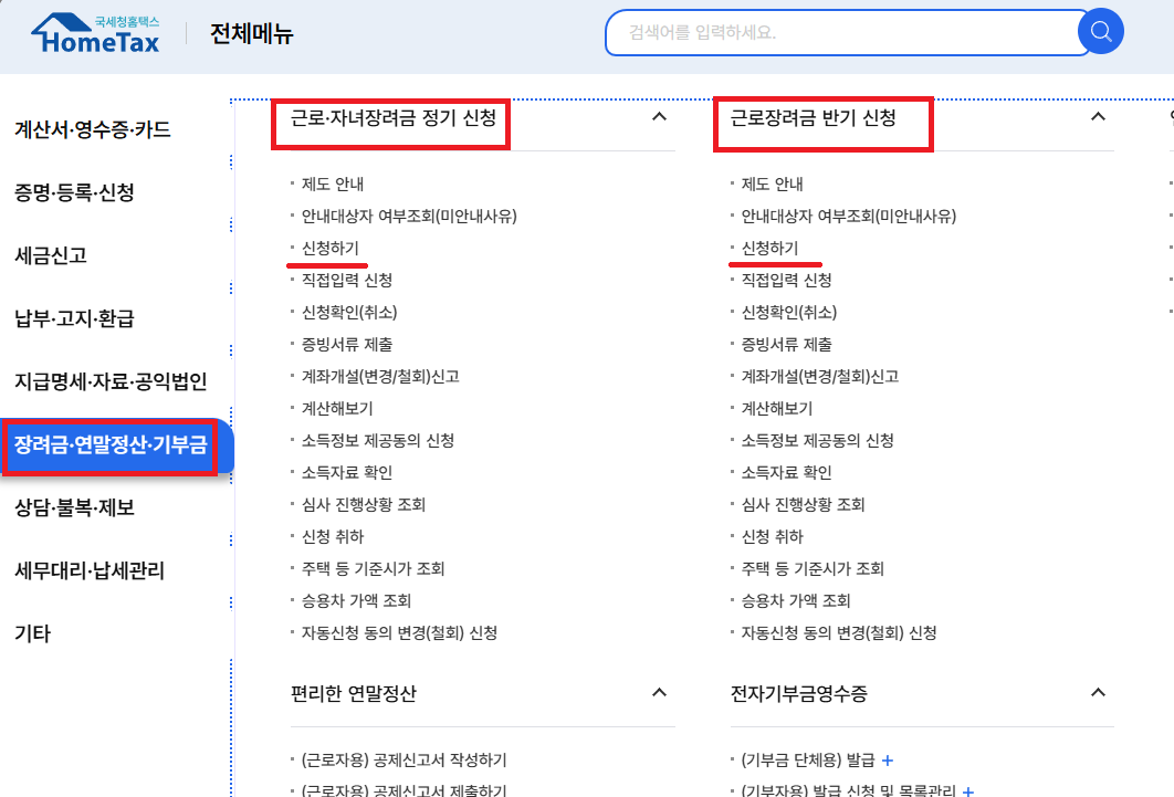 3️⃣ [신청/제출] → [근로장려금 신청하기] 클릭